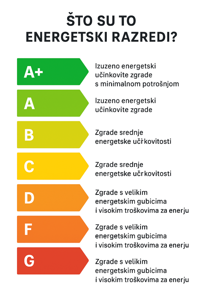 Ukratko, energetski razredi omogućuju vlasnicima i kupcima da brzo i jasno vide koliko je neka nekretnina energetski učinkovita i koliko će troškovi energije dugoročno biti visoki ili niski.